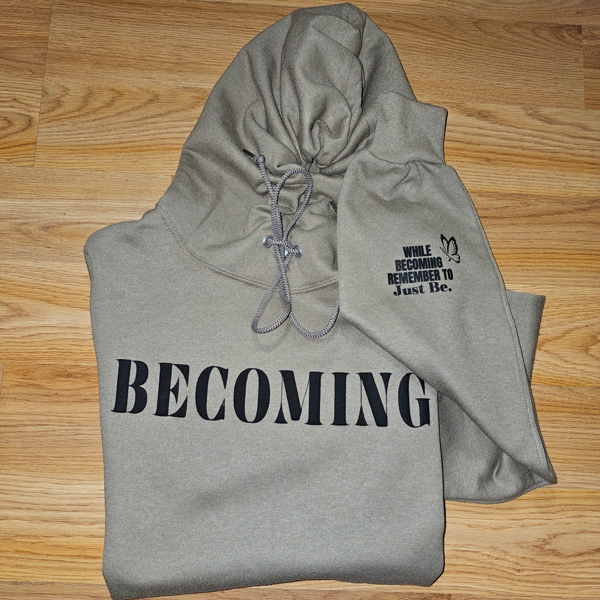 Made from ultra-soft, premium cotton-blend fabric in a bold, confidence-boosting hue, this piece wraps you in both comfort and purpose. The front boldly declares BECOMING—a statement of movement, growth, and transformation—while the sleeve carries a gentle whisper to your soul: “While becoming remember to just be.”