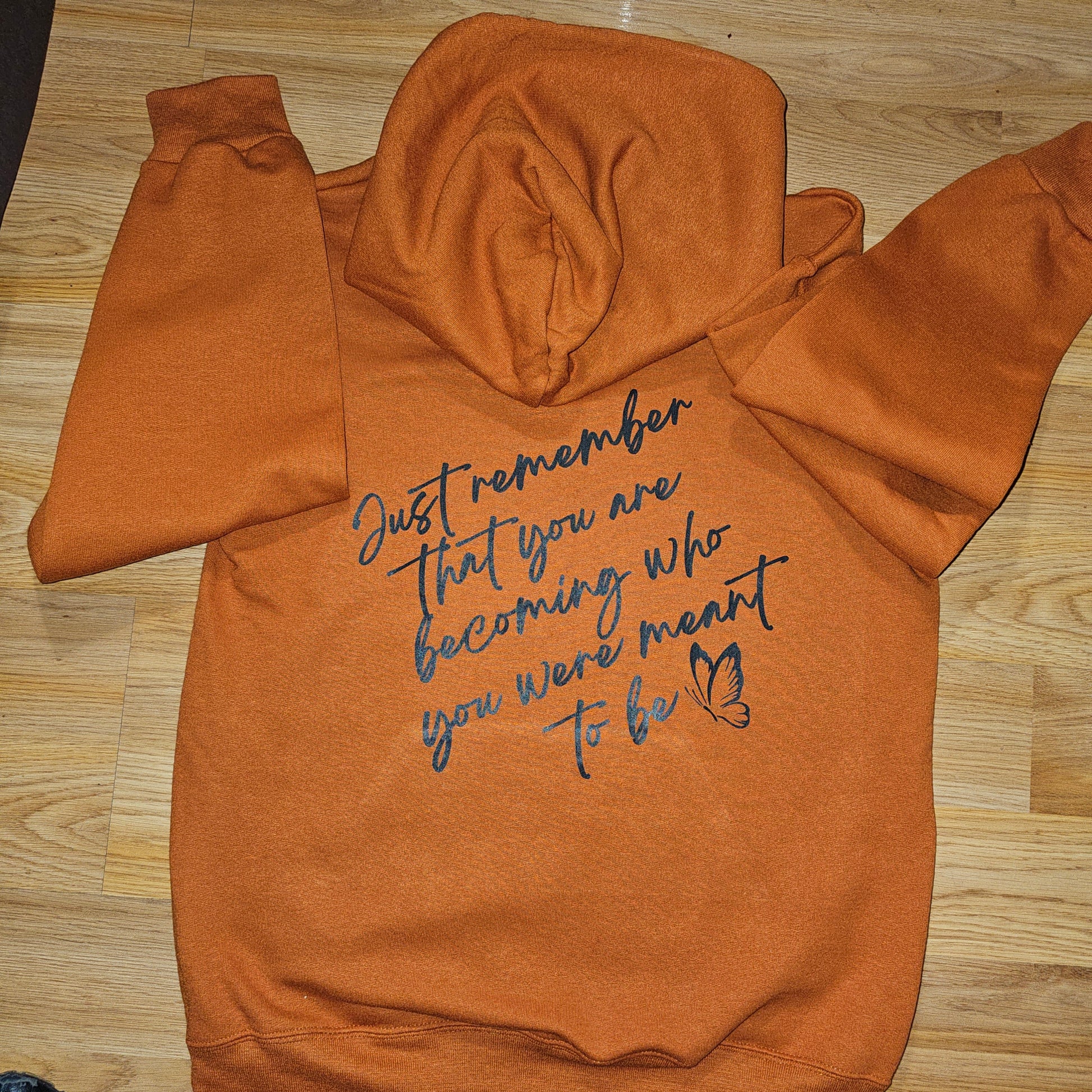 The “Becoming” hoodie is a wearable affirmation that honors your growth journey. The front’s simple yet powerful Becoming design with a butterfly symbolizes transformation and freedom. On the back, a heartfelt message reminds you that every step, every lesson, and every season is shaping you into who you were always meant to be.